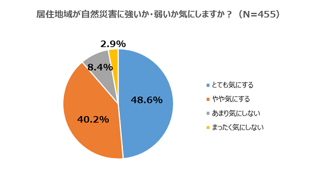 リビン・テクノロジーズ(東京都中央区)は、11月28日の「いい地盤の日」(地盤ネット総合研究制定)に合わせて、同社が運営する不動産関連の比較査定サイト「リビンマッチ」を利用した20歳以上の男女全国480人を対象に「居住地域の自然災害への強弱」についての調査を行った。社宅や寮、実家以外を自宅としている人に「居住地域が自然災害に強いか・弱いか気にするか」を聞いたところ、88.8%が「とても気にする」「やや気にする」と回答。「あまり気にしない」「まったく気にしない」と答えたのは11.3%だった。