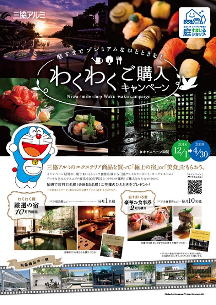 三協立山(富山県高岡市)・三協アルミ社は、同社のエクステリア商品を扱う全国の「庭すまいるショップ」加盟店において、同社商品を「相談」「購入」した顧客を対象としたキャンペーンを実施する。