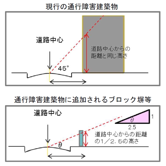 対象となるのは、前面道路に面する部分の長さが25mを超え、かつ、その前面道路に面する部分のいずれかの高さが、道路の中心からの距離の2.5分の1を超えるブロック塀等。規模要件については、一定の範囲内で自治体が変更することができる。施行日は2019年1月1日。