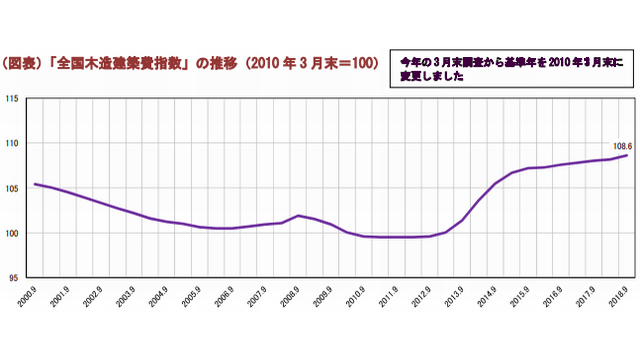 日本不動産研究所(東京都港区)はこのほど、2018年9月末現在の「全国木造建築費指数」を発表した。全国の木造建築費指数は、2010年3月末を100として108.6となった。前期比0.3%上昇となり、2012年9月末調査以降、13期連続の上昇となった。資材価格はおおむね横ばい傾向が続き、建築費は全国的に高止まりの状況が続いているとした。