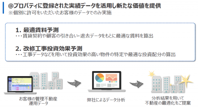同社の施設・不動産向けクラウドサービスに蓄積されたビッグデータを最新のAI技術等により解析し、最適賃料の算出、退去確率・空室期間・改修工事投資効果の予測等を提供。不動産・地理情報等の外部情報を活用し、商業施設売上予測サービスを新たな事業として展開する。