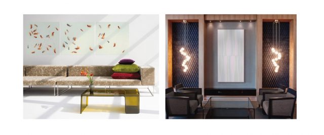「グラールG」は、ガラスの透明感・奥行き感と金魚や染め和紙を閉じこめたデザインが特徴。W900xL900xT4mm。24柄。5万5600円/枚。