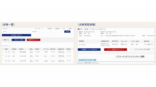 ビルダー向け新機能として、アフターメンテナンス各案件の状況や進捗を確認でき、物件ごとの点検履歴や顧客とのメッセージ履歴も一元管理できる機能や、これまで書面の郵送や電話で行っていた日程調整の連絡を管理画面から一括送信する機能などを追加したという。