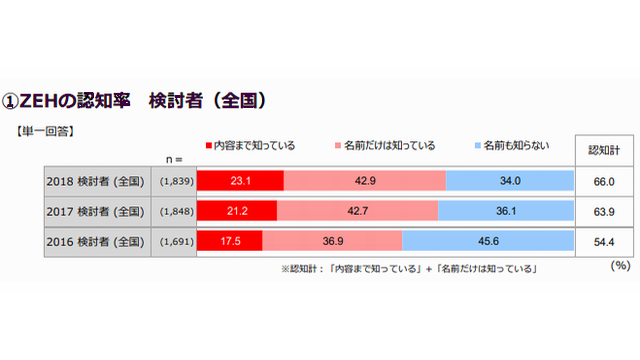 検討者のZEH認知率は66.0%と、対前年で2.1ポイント、対前々年では11.6ポイント増加。建築者のZEH認知者のうち、ZEHを導入した人は17.6%と、前年と同程度の割合だった。ZEH導入による光熱費の経済的メリットは、1カ月平均6609円となった。
