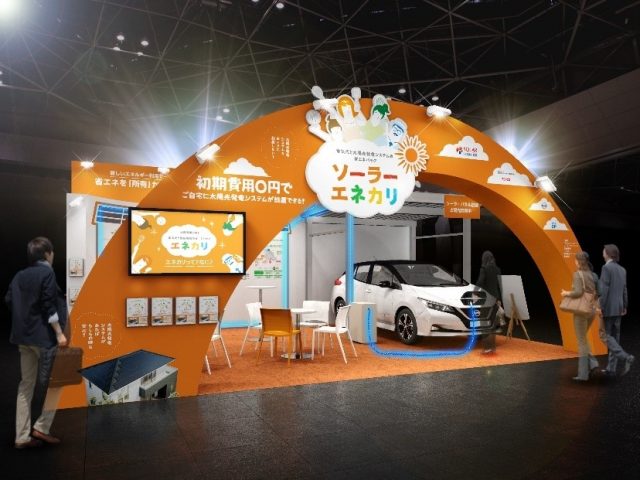 実質初期費用なしの太陽光発電システム設置モデル「ソーラーエネカリ」の仕組みやメリットを案内するもの。2018年7月に「ソーラーエネカリ」販売開始を共同発表した太陽光電池メーカーのソーラーフロンティアのCIS薄膜太陽電池の紹介や「ソーラーエネカリ」の商品ラインアップに追加予定の新たな発電スペースとしてのYKK APの高強度カーポート、電力をクルマから自宅へ給電できる日産自動車の電気自動車(EV)も展示される。