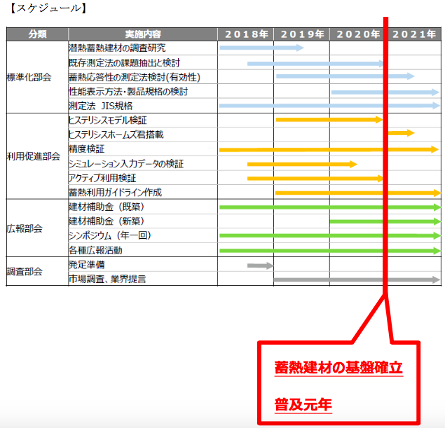 同協会では、コンソーシアムで取り組んできた潜熱蓄熱建材の標準化活動・利用促進活動・広報活動をさらに推進する。具体的には、2021年度完成を目指して、評価方法の標準化(JIS規格の制定)、潜熱蓄熱材を実装した温熱環境シミュレーションソフトの開発、利用ガイドラインの制定を行う。同年度を「普及元年」に位置付けて蓄熱建材の基盤確立を目指す。