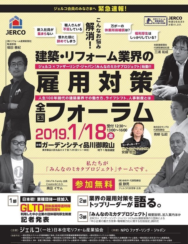 1月18日(金)にはChubb損害保険本社にて雇用対策フォーラムを開催。同保険制度についての詳細な説明を行うほか、職人確保や定着促進、人材戦略などの雇用対策を業界のトップリーダーたちが提言する。詳細・申し込みはジェルコ(電話:03-5541-6050、https://goo.gl/forms/WGG0oCjKlemrYCcr2)まで。