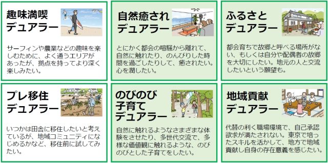 同社が行った調査によると、現代のデュアラーの5割超を20~30代が占め、年収800万円未満の世帯が約半数を占める。同社ではこうしたデュアラーを目的別に、「趣味満喫」「プレ移住」「自然癒され」「のびのび子育て」「ふるさと」「地域貢献」型の6つに分類。新しいデュアルライフが広がっているとする。