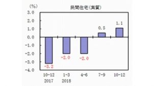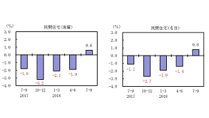 12月18日に閣議了解された2019年度の経済見通しによると、民間住宅投資は名目で前年度比3.3%程度の増加、実質で1.3%程度の増加となる見込み。低金利や消費税率引き上げに伴う経済対策などが要因。日本経済全体の実質GDP成長率は1.3%程度、名目GDP成長率は2.4%程度の見込み。