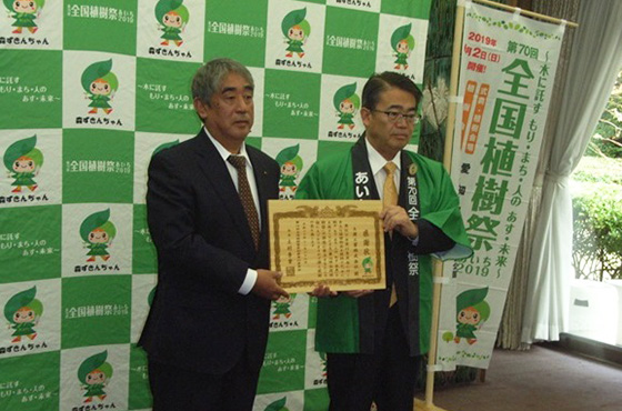 大建工業(大阪市)は、「第70回全国植樹祭あいち2019」の開催にあわせて建て替えられる愛知県森林公園案内所の床材として、愛知県産スギを活用した土足対応床材41坪を愛知県に寄贈した。11月28日、協賛に対する感謝状贈呈式で、愛知県の大村秀章知事から感謝状が贈呈された。