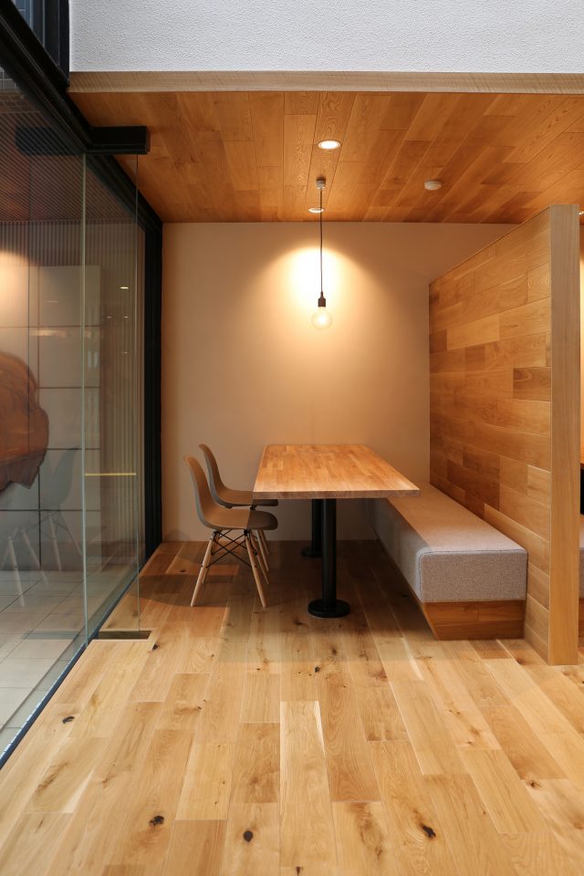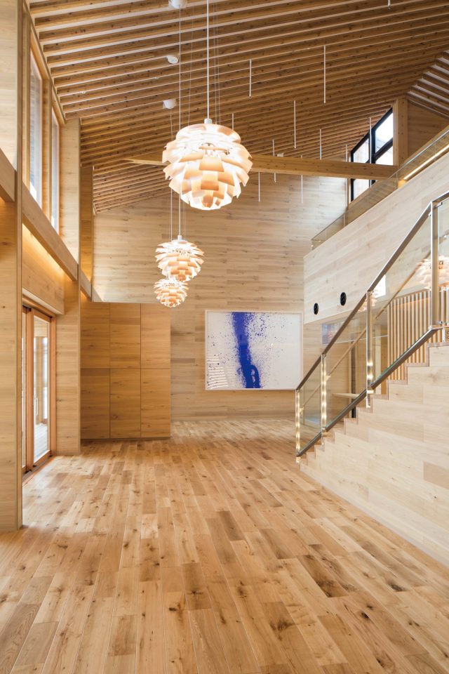にぎやかな節や白太、ダイナミックな斑、杢など、木の個性が味わえる床材。土足使用に対応する強度と耐久性を備える。