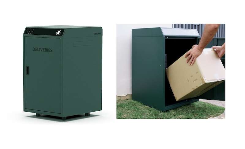 同社は長年、工場や屋外で使用する電気設備を水・ホコリから守るキャビネットを製造してきたが、その技術を応用したスチール製の自立設置型宅配ボックス。防犯性の高いディンプル錠を採用し、荷物を入れて捺印して扉を閉じると自動で施錠する機能を装備する。
