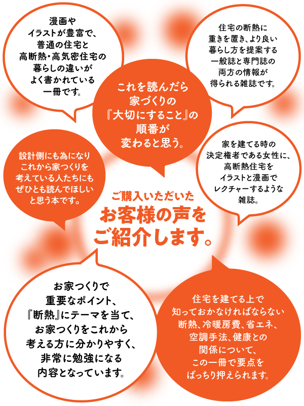 高断熱住宅に特化し、必要性とメリット、住まい手の生の声をコミックや事例などを交え一般生活者に向けて解説・提案しており、大変好評をいただいております。