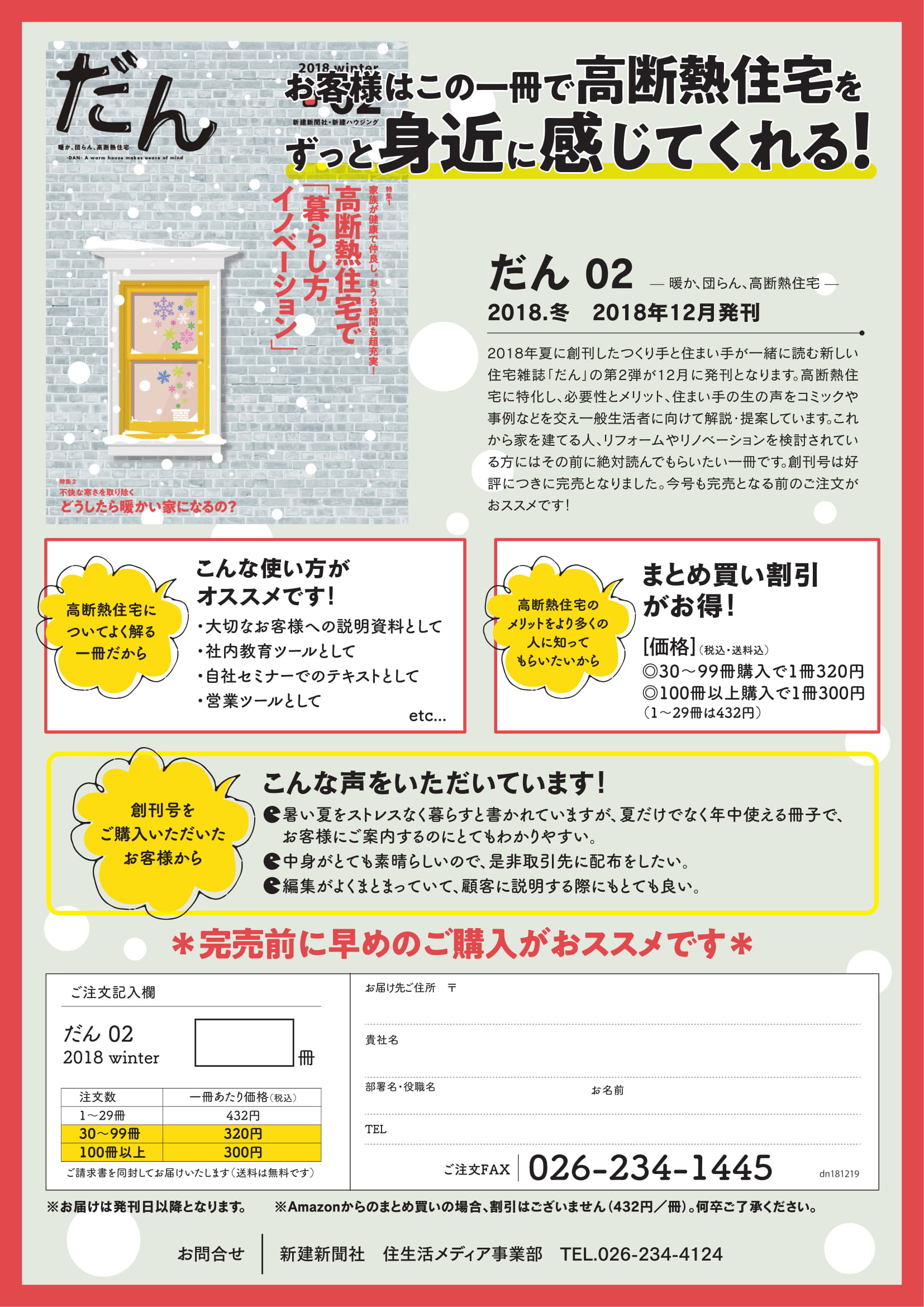 2018年夏に創刊したつくり手と住まい手が一緒に読む新しい住宅雑誌「だん」の第2弾が12月に発刊となりました。