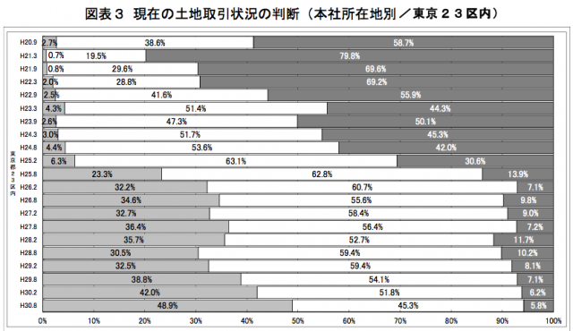 また、「1年後の土地取引状況の予想」についてのDIは、「東京」が同0.9ポイント増の+33.4ポイント、「大阪」が同4.8ポイント減の+21.4ポイント、「その他の地域」が同6.4ポイント減の-4.0ポイントとなった。