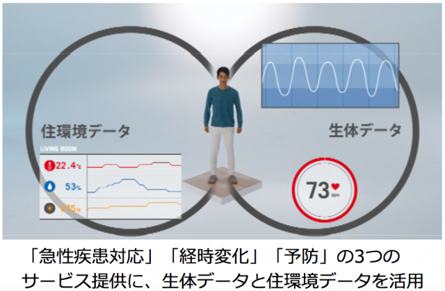 「急性疾患対応」の取り組みでは、家で発症する可能性が高い脳卒中、心筋梗塞等の急性疾患や、浴槽での溺死や転倒・転落等の家庭内事故を「家」が早期発見し、早期治療につなげることで、社会コスト削減やQOL向上にも寄与する。