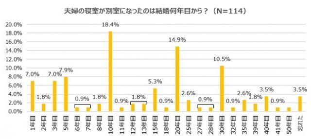 別室になったのは、「結婚10年目から」がもっとも多く18.4%。以降「20年目」(14.9%)、「30年目」(10.5%)と、区切りの良い年数で多くなっていることがわかった。また、「1年目」「3年目」で7%、「5年目」で7.9%と、5年以下で別室となったのは、23.7%だった。
