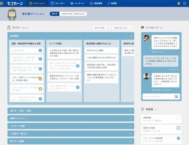 開発中のアプリは、図面や資料のクラウド管理ができるほか、工程の割り当てを作成したり、各工程のタスク管理や報告チェックが可能。また、ファイル送付可能なチャットや、プロジェクト横断管理機能などをを搭載する予定。2019年夏ごろの提供を予定している。