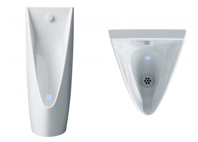TOTO(福岡県北九州市)は2月1日、人が近づくと青色LEDで尿はねしにくいポイントに誘導する小便器の最上位モデル「マイクロ波センサー壁掛小便器セット」を発売する。