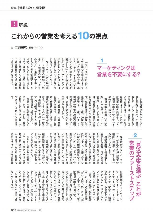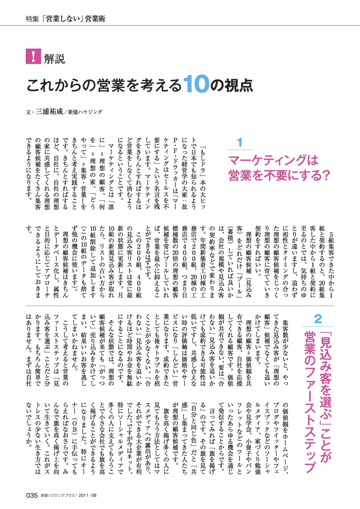 「新建ハウジングプラスワン」2011年8月号の特集は『「営業しない」営業術』と題し、従来型の「売り込み」営業からの脱却する方法を、事例とコラムで解説しています。