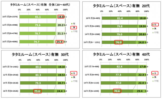 タタミルーム(タタミスペース含む)の有無では、「無し」の割合が16年度に25.3%となり、10年度比で6.5ポイント増加した。一方、「有り」の割合を16年度の年代別でみると、20代が76.0%、30代が75.6%、40代が70.6%となり、若い世代ほどタタミルームを採用していることが分かった。