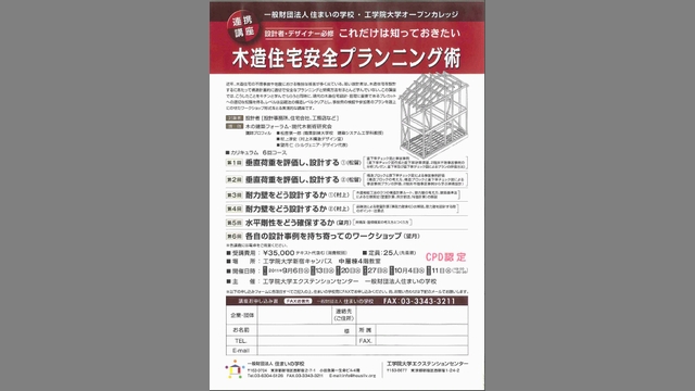 一般財団法人住まいの学校(東京都新宿区)と工学院大学エクステンションセンター(同)は、設計事務所や工務店などに所属する設計者を対象とした木造住宅の構造計画を学ぶ連続講座「木造住宅安全プランニング術」を開講する。