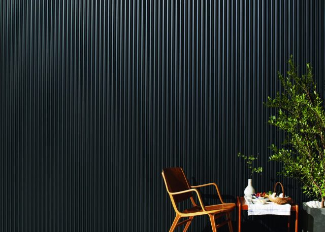 2種類の傾斜がつくり出す独創的な幾何学デザインは、明るさや見る角度によって表情が違うという。赤さび・穴あき15年保証、塗膜変色・褪色10年保証。4色。5036円/m2。