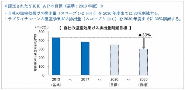 YKK AP(東京都千代田区)は、同社の取り組む中長期的な温室効果ガスの削減目標が、パリ協定の「2℃目標」を達成するための科学的根拠に基づいた目標であると認められ、国際的な団体「SBTイニシアチブ」から認定を取得した。