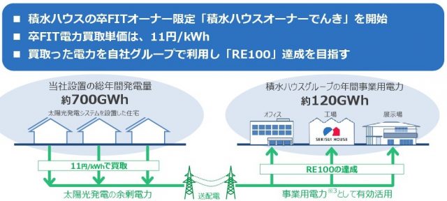 同社は、戸建て住宅や賃貸住宅などに累計で700MW以上の太陽光発電システムを設置。年間発電量は約700GWhという。これらの約2~3割の卒FIT(買い取り期間満了)電力を買い取ることで年間約120GWhの同社グループの事業用電力を賄うことができ、「RE100」の達成が可能と試算している。