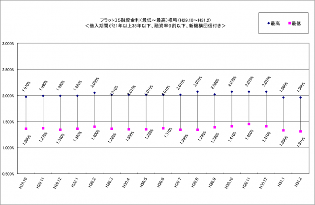 住宅金融支援機構(東京都文京区)が2月1日発表した、各金融機関の長期固定金利住宅ローン「フラット35」の2月分の金利は、主力の融資率9割以下・借入期間21年以上の場合で、年1.31%~年1.96%だった。最低金利の1.31%は3カ月連続の下降となった。
