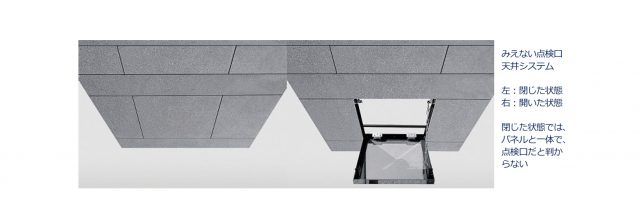 菊川工業(東京都墨田区)は、ビジュアルを重視し、点検口が組み込まれているとはわからない金属天井「みえない点検口天井システム」の販売を開始した。