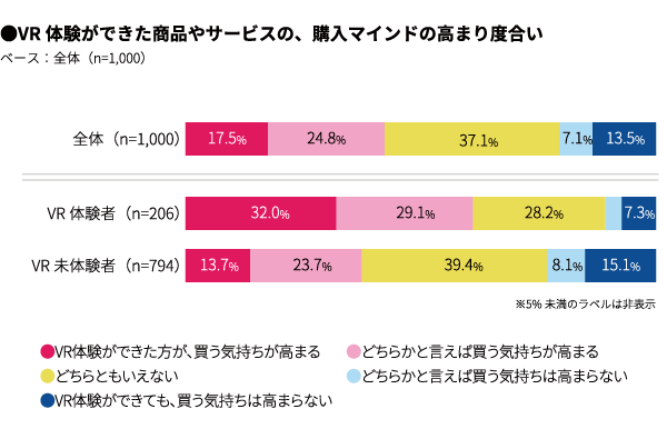 マクロミル(東京都港区)は2月7日、全国の15歳から69歳の男女を対象に実施した「VR」に関する意識調査(有効サンプル=1000)の結果を発表した。それによると、不動産の内覧や住宅リフォームの完成イメージなど、サービス・商品購入前にVR体験をした場合、買う気持ちが「高まる」とした人は17.5%、「どちらかといえば高まる」は25%で、合計42%が「購入意欲が高まると思う」と回答していることがわかった。このうち、実際にVRを体験したことがある人は61.1%が「購入意欲が高まる」としているのに対し、VR未体験者は37.4%にとどまっている。