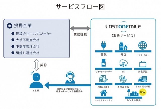 同事業は、提携先の不動産会社顧客に、ガス・通信回線などのライフラインや引っ越し運送の手配・不用品買取など、転居・新生活に関わるさまざまな手続きをワンストップで案内するBtoBtoC事業。今回の業務提携では、買うのではなく借りる、というモノへの意識の変化に対応し、転居時にかかる手間や経済的負担を軽減するサービスの拡充を図るという。