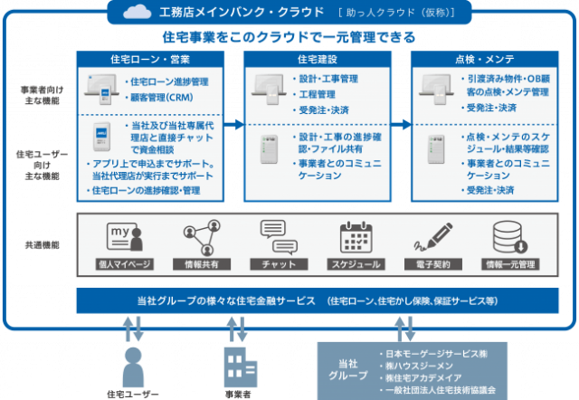 住宅金融サービスの日本モーゲージサービス(東京都港区)は、住宅事業の顧客管理から資金相談・ローン融資、決済までの住宅金融サービスを提供するために同社の連結子会社と共同で「工務店メインバンク・クラウド」を3月から順次運用する。