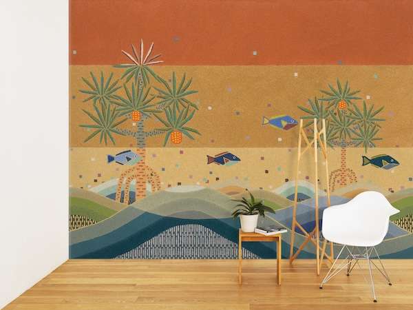 本を使った空間コーディネートなどを手がける「LIBRO STYLE」とコラボレーションした壁紙の新商品「COLLABORATIONS-LIBRO STYLE」3柄17点をラインアップ。本が飾られている空間をさまざまなテイストに落とし込んだ。5000円/m2。