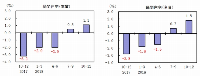 内閣府は2月14日、2018年10~12月期の四半期別GDP速報(1次速報値)を発表した。GDP成長率(季節調整済前期比)は、物価変動の影響などを考慮した実質で0.3%増(年率1.4%増)、名目0.3%増(年率1.1%増)となった。民間住宅は、実質1.2%増(7~9月期は0.5%増)、名目1.8%増(同0.7%増)だった。2期連続のプラスとなった。