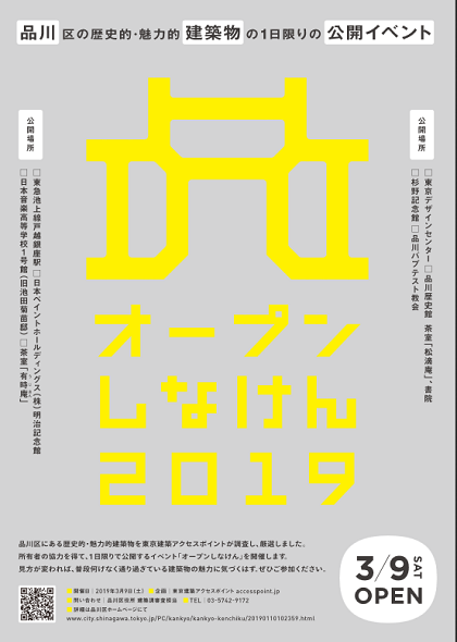 東京都品川区は一般社団法人東京建築アクセスポイント(東京都新宿区)と連携を図り、区内にある歴史的・魅力的建築物を公開するイベント「オープンしなけん」を3月9日に開催する。
