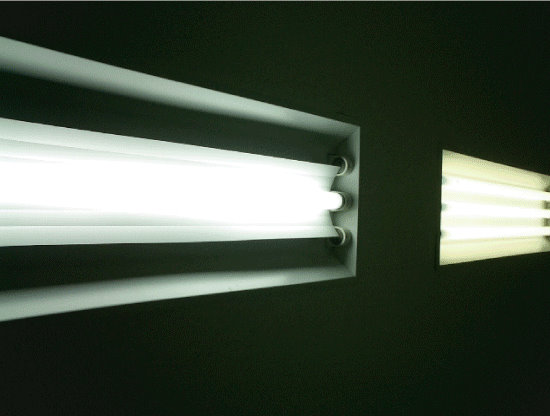 ある製造業の自社工場では、高天井の1灯4列の配置を、反射板を使用することで1灯4列の配置を1灯2列の配置に切り替えることで、蛍光灯250本を削減。50%の節電に成功した。