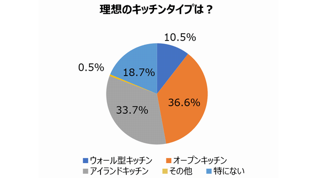 アクア(東京都中央区)はこのほど、自宅での家族との過ごし方やキッチンへの不満・要望に関する調査を実施し、その結果を発表した。「理想のキッチンタイプ」を尋ねたところ、キッチンの側面が壁についているオープンキッチン(36.6%)と答えた人が最も多く、次いで独立しているアイランドキッチン(33.7%)、壁に向いているウォール型キッチン(18.7%)と続いた。7割超がオープンキッチンやアイランドキッチンといった対面型のキッチンを理想としていることから、キッチンとダイニング空間のシームレス化の進行がうかがえるとする。キッチン選択の理由としては、46.3%が「家族とのコミュニケーションがとりやすいから」と回答。共働き世帯を中心に、食事の支度時間も家族との時間にしたいと考える人が多いことがわかった。