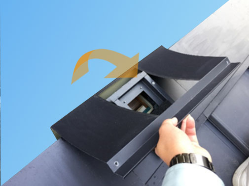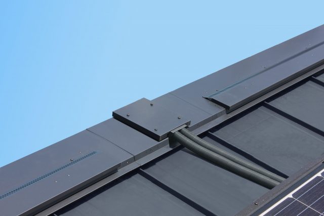 そこで、0.5寸勾配の片流れ屋根に対しても防水性能を確保し、屋根から入線可能な部材を開発。製品本体がジョイント機能をもつためワンモーションで簡単に取り付けることができ、棟部からケーブルを入線するため住宅外観を損なうことなく太陽光パネルを設置できる。