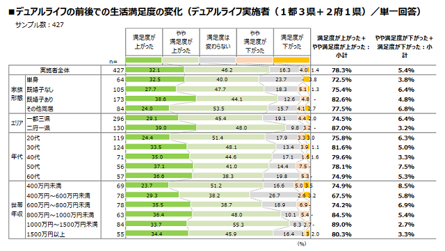 調査対象は、1都3県(東京・千葉・埼玉・神奈川)、2府1県(京都・大阪・兵庫)在住で、デュアルライフを実施しているまたは実施意向がある20~69歳の男女。有効回答数1039件、分析対象回答数427件。