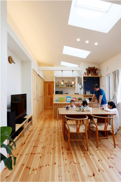 サンプロの「細ながーいsunsun住宅」は、間口が狭く、奥に長い形状の店舗併用住宅を2世帯住宅にリモデルしたもの。南面は隣家との関係で窓が設けられないため、北面に長い廊下と窓を設けて光と動線を確保。LDKを2階の中央に配し、3カ所に設けた天窓や、白と自然素材を使用した内装により明るく清々しい空間を演出した。難しい立地条件ながら、様々な工夫により、明るく快適な2世帯住宅を実現したところが評価された。