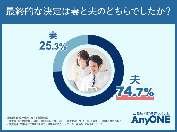 建設業界に特化した基幹システムを開発・販売するエニワンは、戸建て住宅の建築経験のある既婚男女を対象に家づくりの決定過程についてアンケート調査を実施した。最終的な決定者に関する質問では、「夫」が74.7%で「妻」が25.3%だった。