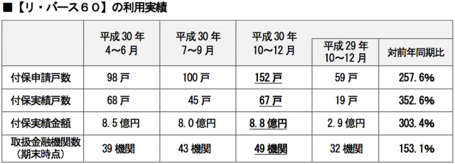 住宅金融支援機構(東京都文京区)は2月26日、住宅融資保険を活用したリバースモーゲージ型住宅ローン(「リ・バース60」)の2018年10月~12月利用実績を公表した。付保申請戸数は152戸で前年同期比257.6%、付保実績戸数は67戸で同352.6%となった。取扱金融機関数(期末時点)は、前年同期の32機関から49機関に増加した。