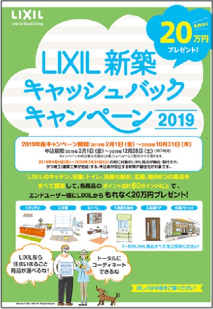 LIXIL(東京都千代田区)は、新築の施主を対象にした「LIXIL新築キャッシュバックキャンペーン2019」を、全国92カ所の同社ショールームで開催する。キャンペーン期間は10月31日まで。