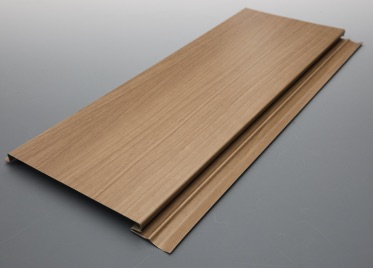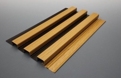 リブ型とフラット型の2形状。リブ型は、木目と黒地を交互に印刷したものを凹凸に加工することで、ルーバーのように見せることができるとする。