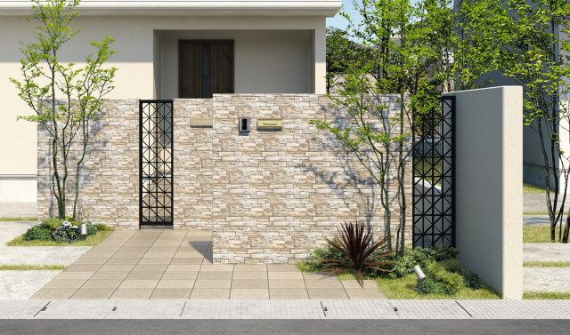 アルミ押出形材の断面をブロックのように組み合わせ、フェンス状にしたファサード部材。ランダムスクエア柄・ダイヤ柄・七宝柄の3デザインを用意した。専用部品を使って直接塀の所々にワンポイントとして納める「壁付けタイプ」と、支柱を使って独立施工する「間仕切り支柱タイプ」の2種類の納まりタイプがある。 色はブラック。