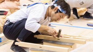 今回の大会には533人の熟練技能者が参加。建設部門では、石工、建築大工、かわらぶき、畳製作、建築配管、プラスチック系床仕上げ、カーペット系床仕上げ、壁装、タイル張り、造園の10職種で合計200人が参加した。「建築大工」の競技は47人が参加し、池田技建(東京都練馬区)の長谷川裕樹さんが優勝した。