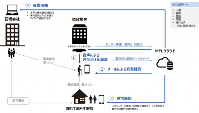 異常を察知した場合、同ライトに搭載されたマイクとスピーカー機能を用いて音声による呼びかけと録音。その後、本人に安否確認メールを送る。本人のメール開封確認がなかった場合、離れて暮らす家族とマンション管理会社に通報する仕組み。