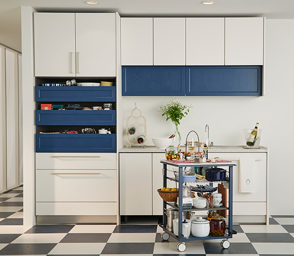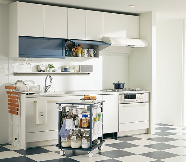 なかでも、ワークトップワゴンは好きな場所に移動して自由に使えるため、天板の上でお菓子やパンをつくったり、ダイニングやベランダに移動して調理・作業・配膳台などとして利用することができる。